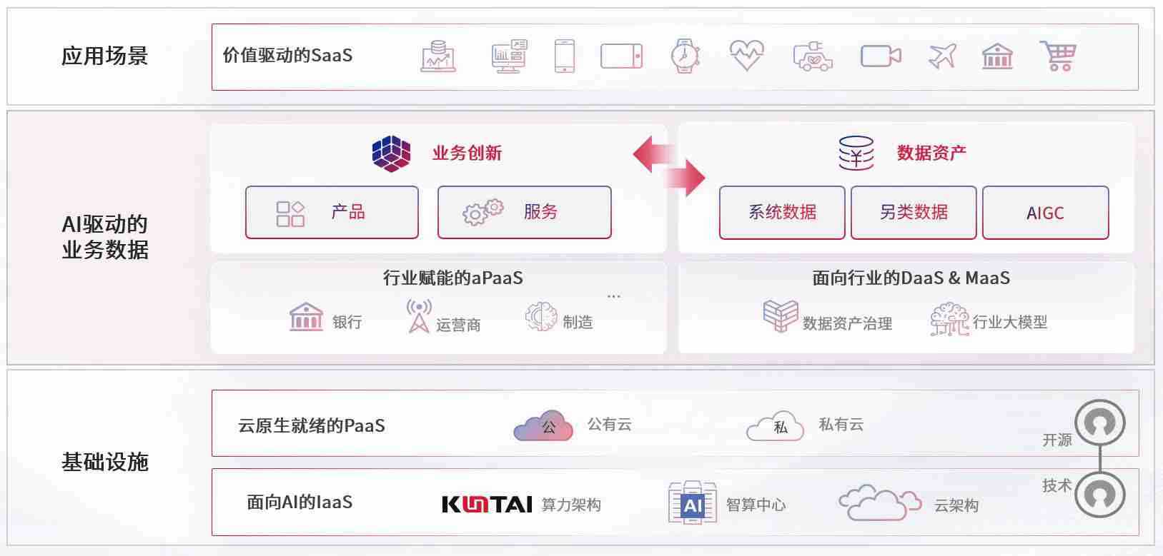 数字时代,,,,围绕企业数字化转型的关键要素,,腾博tengbo9885官网数码开创性的提出数云融合战略和技术体系框架,,,,着力在云原生、、、、数字原生、、、、AI原生和信创产业上架构产品和服务能力,,为处在不同数字化转型阶段的快消零售、、、、汽车、、、金融、、医疗、、、政企、、教育、、运营商等行业客户提供泛在的敏捷IT能力和融合的数据驱动能力,,,构建跨界融合创新的数字业务场景和新业务模式,,助力企业级客户建立面向未来的核心能力和竞争优势,,全面推动社会的数字化、、、、智能化转型升级。。。